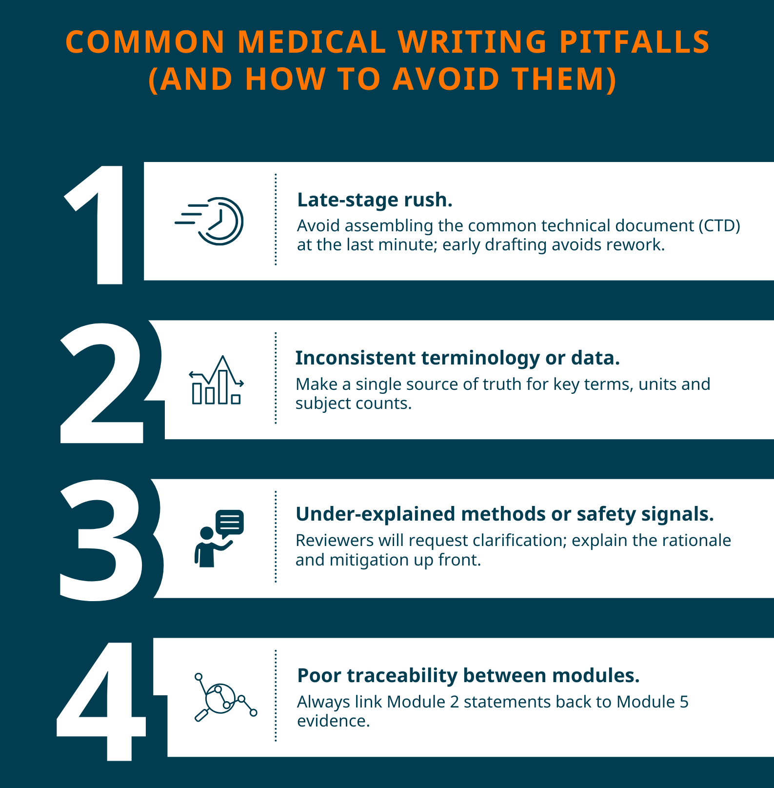 - Use standard headings and templates. Following ICH E3 and CTD conventions reduces review friction.